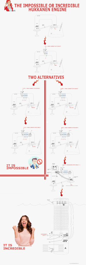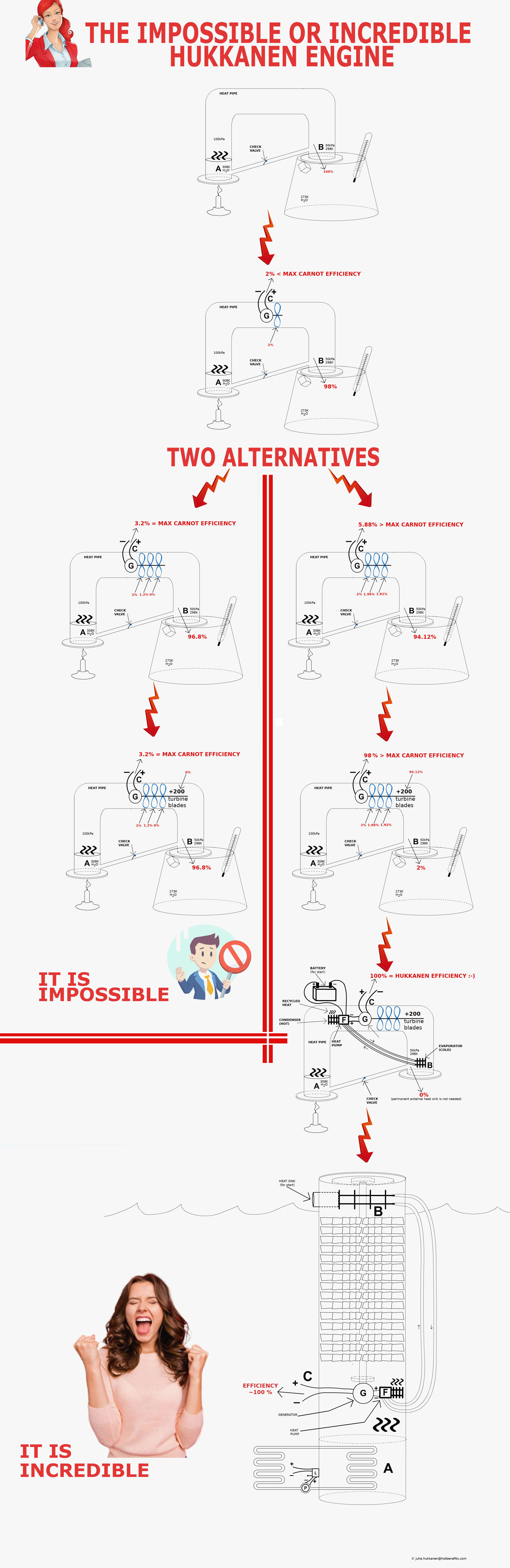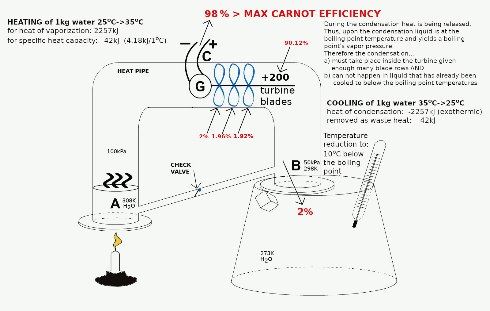 I created a simple (~one moving part) heat pipe + turbine design, which permanently maintains a higher turbine entry side pressure and recycles all waste heat from the turbine’s exit side. Molecules at a high-pressure heating area (A) will always flow towards the low-pressure cooling area (B). In doing so, the molecules must always go through every single of the turbine blades, and they necessarily lose some of the system’s internal energy to each of the turbine blades. After irreversibly losing the heat of vaporization (~98% of the added energy), the steam condenses to liquid. The condensed liquid must then be further cooled to maintain the low-pressure area at cooling area (B) of the heat pipe. As up to 98% of the internal energy was converted into electricity, 3% of that electricity can now be used for powering a heat pump to remove the remaining 2% of added thermal energy from the cooling area B.