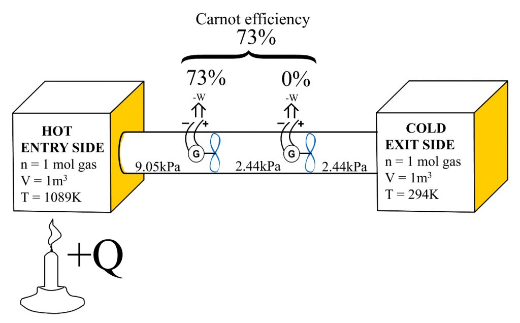 In this demonstration, an almost similar device arrangement can be used as was used earlier with evidence1. The difference this time is that we have two independent heat engines placed inside that pipe that connects the “Hot Entry Side” and “Cold Exit Side.” Picture 2 show this arrangement. In picture 2, we initially assume that the Hot Entry Side has been heated to 1089K, causing the 1mol of ideal gas inside the 1m3 container to obtain a pressure of 9054.45Pa. Similarly, we assume that the “Cold Exit Side” container with 1 mol of an ideal gas and a volume of 1m3 will obtain a 2444.45Pa pressure. Earlier, the Carnot efficiency for this kind of system was calculated to be 0.73003.