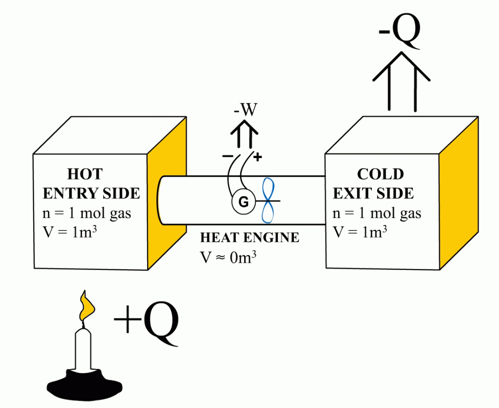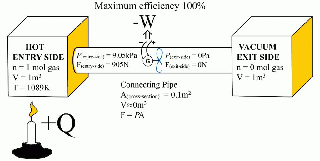 If the “Cold Exit Side” exhibits no pressure, the heat engine can operate with up to 100% efficiency