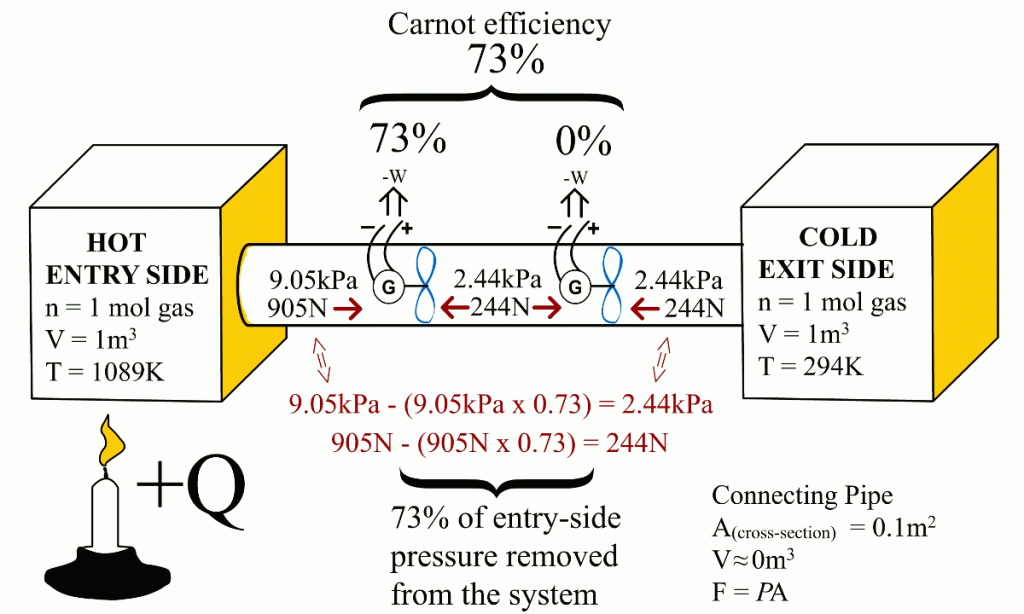 Picture 2 and Table 3 indicate that the “Hot Entry Side” pressure cannot be reduced more than the Carnot efficiency percentage. For example, if the left side heat engine, that is shown in picture 2, could operate with a thermal efficiency of 74%, it would cause the “Cold Exit Side” container to have a higher pressure than is the pressure between those two heat engines; causing the molecules from the “Cold Exit Side” to flow towards the area between those heat engines. As shown in tables 2 and 3, the heat engine’s efficiency is zero when the entry side pressure equals exit side pressure. It was also demonstrated that when the entry side pressure is reduced by a percentage equal to the Carnot efficiency, that reduced pressure level will be the pressure level that exists at the “Cold Exit Side.”