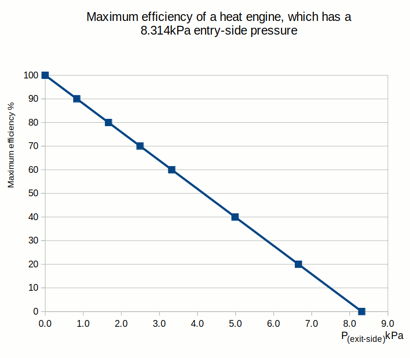 The pressure at the “Cold Exit Side” reduces the thermal efficiency which the heat engine can achieve; by pushing back and opposing the flow of the molecules coming from the Hot Entry Side.