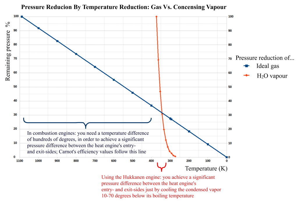 Carnot efficiency is nothing but a 100% removal of the ideal gases’ over-pressure present at the heat engine’s entry-side. And basically, the traditional heat engines have just used heat to increase the heat engine’s entry-side’s over-pressure for the purpose of achieving a pressure difference between the heat engine’s entry- and exit-sides. Using my invention, an enormous and non-linearly increasing pressure difference can be achieved between the heat engines entry- and exit-sides by continuing to cool down the already condensed fluid / vapor at the heat engine’s exit-side. See the picture below.